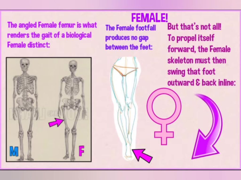 The best way to tell if a man has a female skeleton is by checking his gait when he’s walking straight; inline foot fall equals female skeleton.